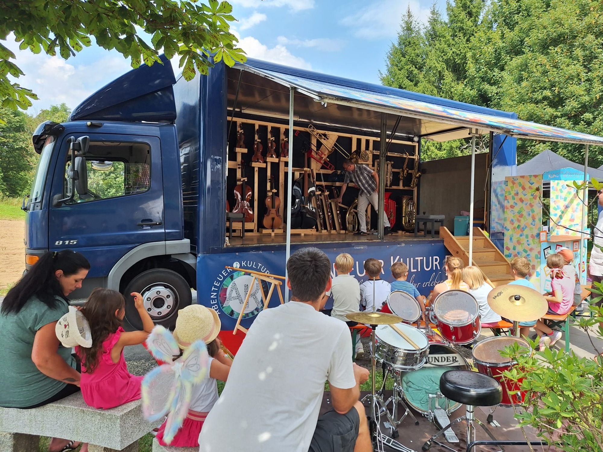 Zuerst konnten die Kinder verschiedene Instrumente im Musiktruck kennenlernen und ausprobieren. Danach kamen die Erwachsenen dran.