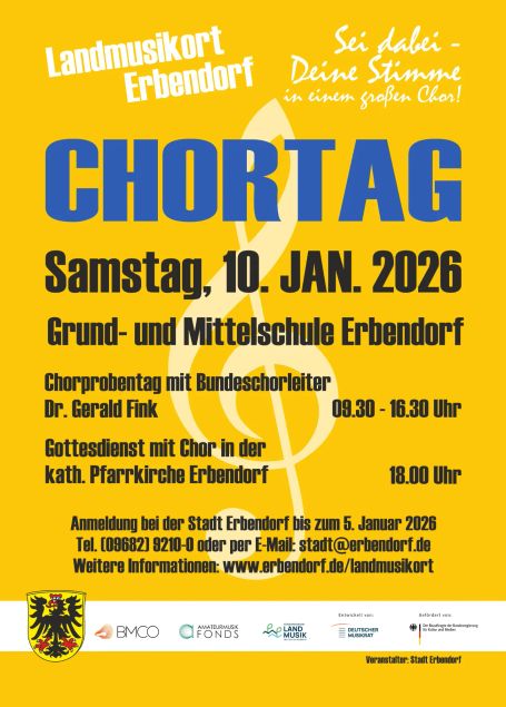 Anmeldungen zum Chortag am 10. Januar 2026 werden bis spätestens 5. Januar 2026 von der Stadt Erbendorf unter Telefon (09682) 9210-0 oder per E-Mail stadt@erbendorf.de entgegengenommen.