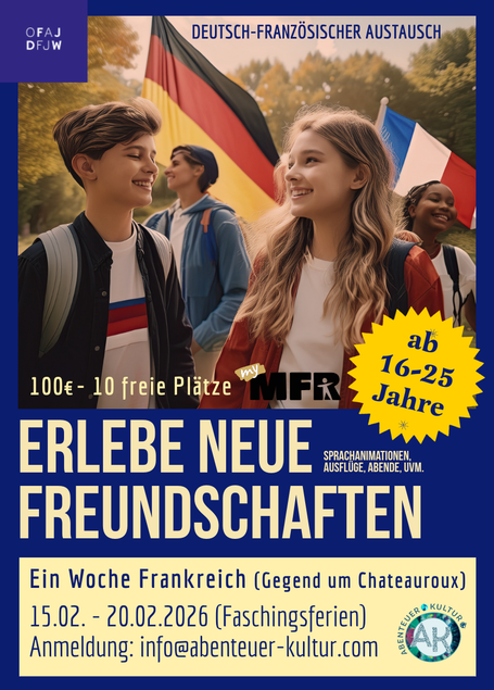 Vom 15.02. bis 20.02.2026 findet in den Faschingsferien ein deutsch-französischer Jugendaustausch in der Region Châteauroux statt. Eingeladen sind junge Menschen im Alter von 16 bis 25 Jahren, die Lust haben, neue Kontakte zu knüpfen und Frankreich in einem internationalen Umfeld kennenzulernen.
